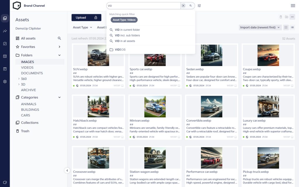 DemoUp Cliplister bietet Dutzende von Tools, die Ihnen helfen, Ihre Vermögenswerte effektiv zu speichern. Es unterstützt Einzel- oder Massen-Upload von Dateien, Cloud-Speicher, Video-Transkodierung und erweiterte KI-Suche. Außerdem ist es skalierbar, um mit Ihrem Unternehmen zu wachsen.